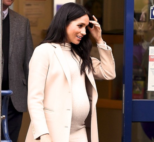 Wearing her Beige Armani  Cashmere Coat (first worn last October on her engagement to Sussex), HRH also wore the MAMA fine knit dress from the H & M Maternity range.