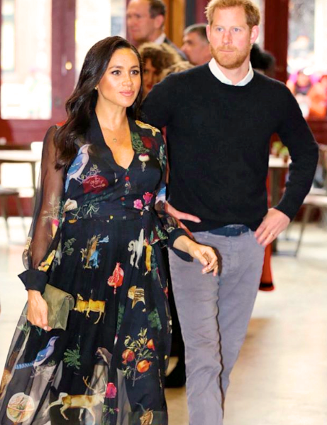 HRH, Prince Harry the Duke of Sussex paired grey trousers with a navy jumper and classic coat as he accompanied his wife on the walkabout.