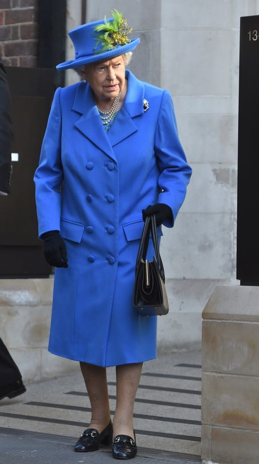 For her first official engagement of the year, Her Majesty was dressed in a bright blue coat and matching hat which had green feather decorations.