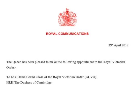 In addition, the Duchess of Cambridge has today been made a Dame Grand Cross of the Royal Victorian Order.