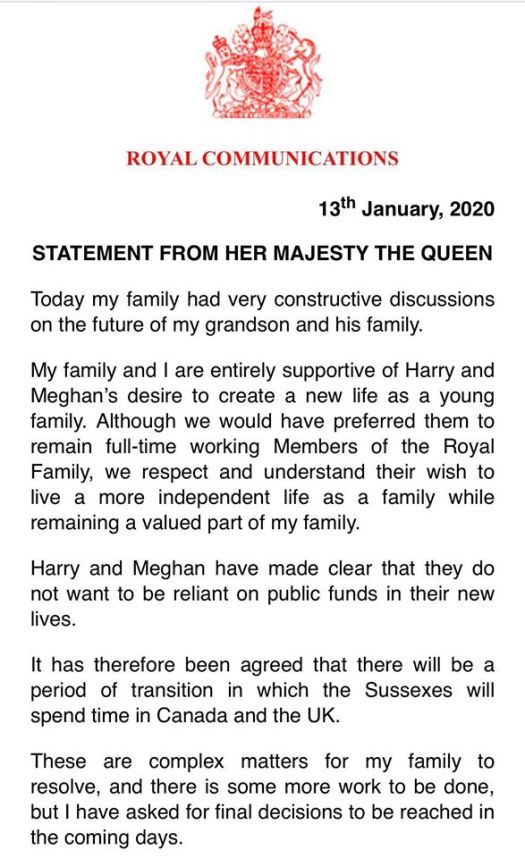 ““After many months of reflection and internal discussions, we have chosen to make a transition this year in starting to carve out a progressive new role within this institution. We intend to step back as ‘senior’ members of the Royal Family and work to become financially independent, while continuing to fully support Her Majesty The Queen. It is with your encouragement, particularly over the last few years, that we feel prepared to make this adjustment. We now plan to balance our time between the United Kingdom and North America, continuing to honour our duty to The Queen, the Commonwealth, and our patronages. This geographic balance will enable us to raise our son with an appreciation for the royal tradition into which he was born, while also providing our family with the space to focus on the next chapter, including the launch of our new charitable entity. We look forward to sharing the full details of this exciting next step in due course, as we continue to collaborate with Her Majesty The Queen, The Prince of Wales, The Duke of Cambridge and all relevant parties. Until then, please accept our deepest thanks for your continued support.” – The Duke and Duchess of Sussex”