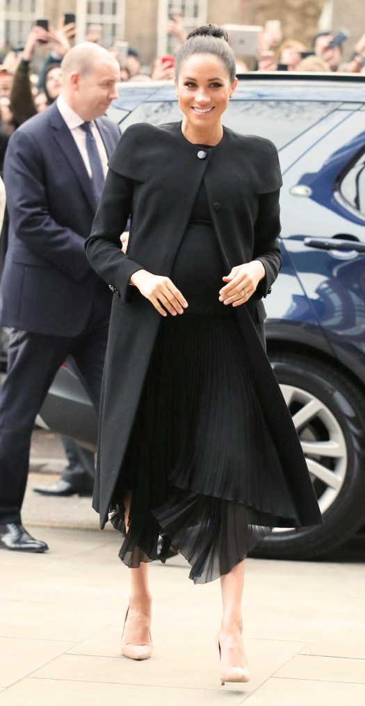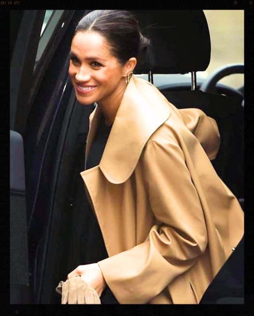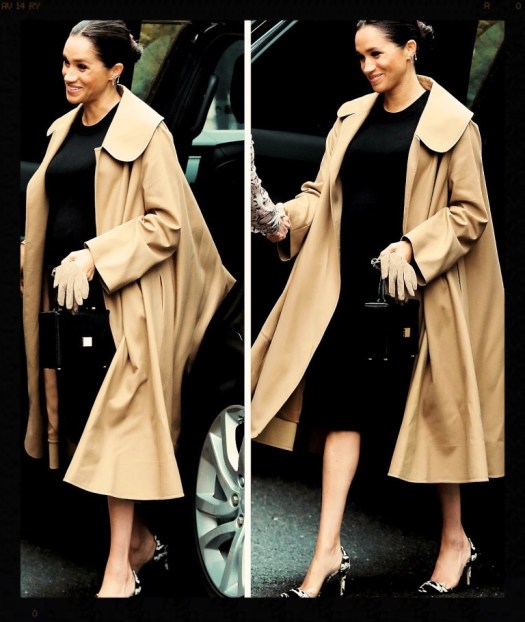 For this engagement, HRH Meghan the Duchess of Sussex was dressed in a stylish camel coat by Oscar De La Renta, the ”Plexi” Cow Print Pumps by Gianvito Rossi, a box bag by Victoria Beckham, the “Felicity”earrings by sustainable brand Kimai, and a black maternity dress from HATCH collection.