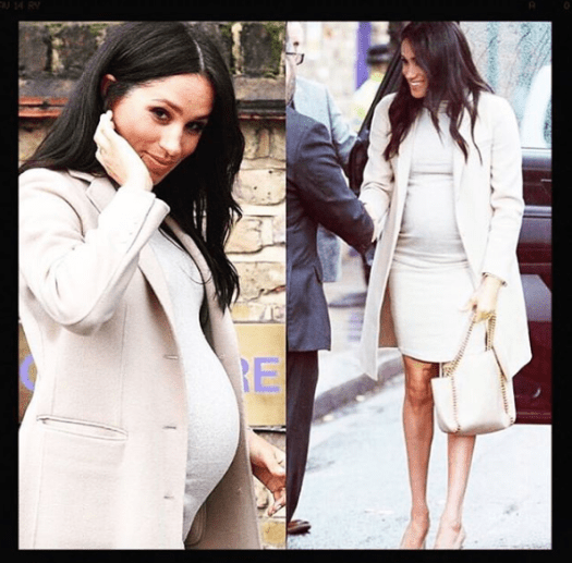 Wearing her Beige Armani Cashmere Coat (first worn last October on her engagement to Sussex), HRH also wore the MAMA fine knit dress from the H & M Maternity range.
